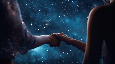 Close up of human hands holding each other with stars in the background