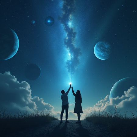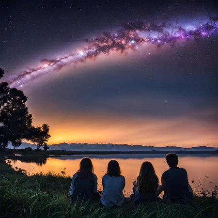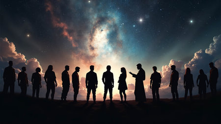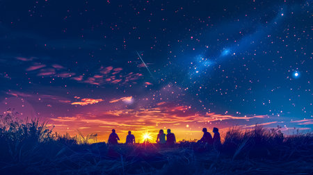 Concept photo of a small group of individuals sitting in a circle, holding hands and gazing up at a vast starry sky, in awe of the vastness and mystery of the universe