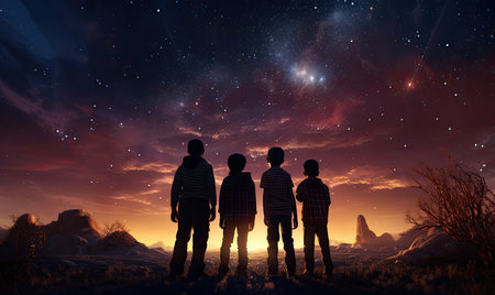 Three children sit on mountain at dusk, gazing at vibrant, colorful sky filled with stars and glowing clouds, evoking wonder and awe