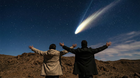 Awe-inspiring view of two figures in a desert landscape with arms raised in wonder at a brilliant comet blazing through the dark blue sky.