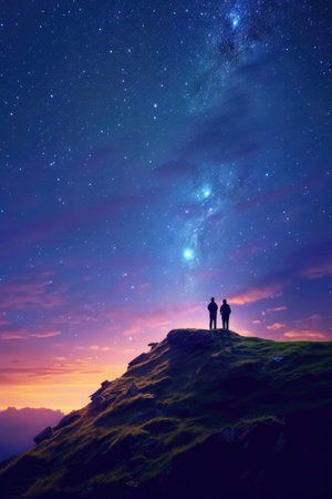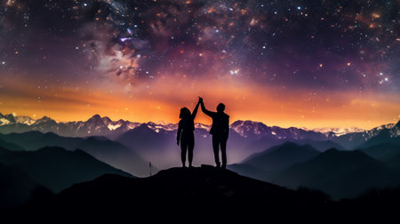 Silhouette of two hikers were standing at the top of the mountain looking at the stars over the twilight sky. Colorful realistic illustration. Generative AI art