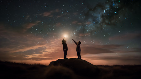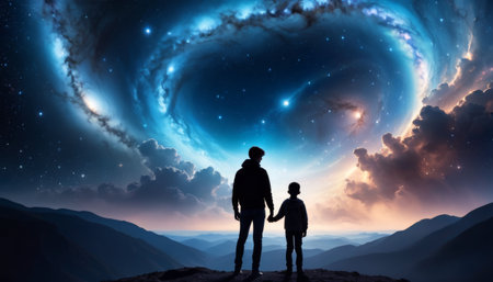 A man and a child stand mesmerized by a magnificent night sky swirling with stars and nebulae above a mountain valley.. AI Generation