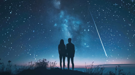 silhouette of a couple with their backs turned, standing on top of a hill, witnessing the beauty of a meteor shower in the night sky generative ai