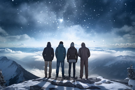 People Standing Together on a Mountain Range Under a Starry Night Sky with Radiant Light Network