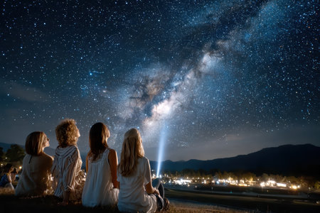 Back view photo of a group of girlfriends watching bright stars in the night sky. Generative AI