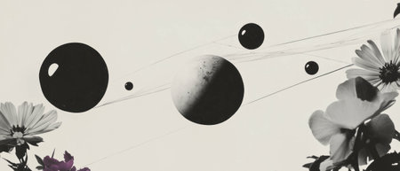 Minimalist collage of shapes and flowers with dewdrop on spider web