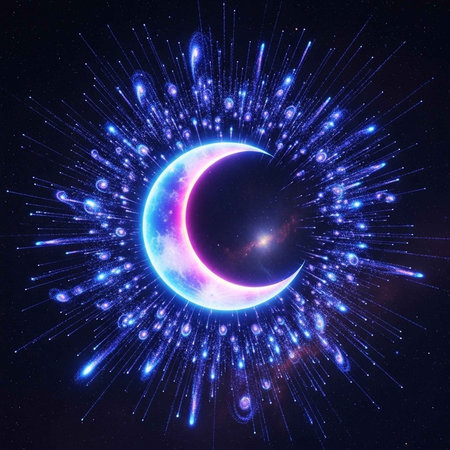 A stylized crescent moon with glowing purple and blue hues, surrounded by dynamic light rays and sparkling particles against a dark background.