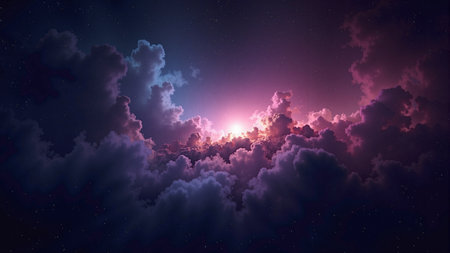 Vivid purple night sky with glowing clouds and scattered stars, tranquil atmosphere and cosmic celestial backdrop.