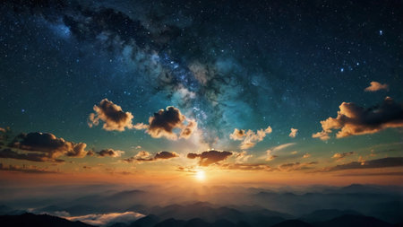 A stunning view of galaxy above fluffy clouds during twilight, showcasing blend of stars and cosmic beauty