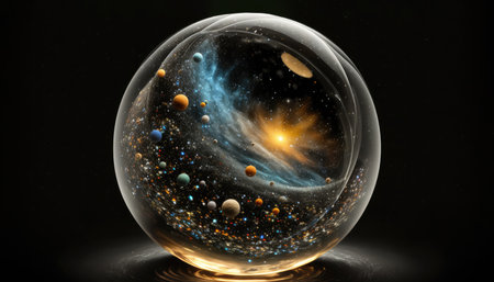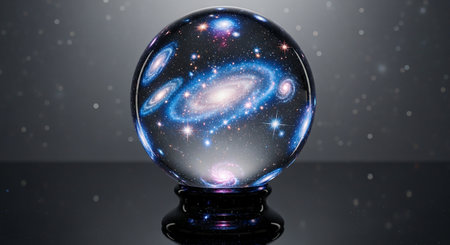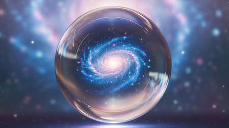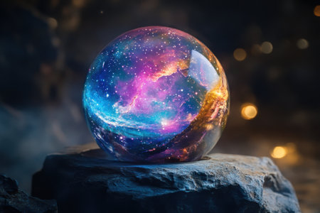 A glass sphere containing a vibrant, swirling galaxy with glowing stars and cosmic dust.