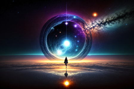 Celestial bodies float in a galaxy filled with colorful nebulae, creating a mesmerizing reflection in the void.