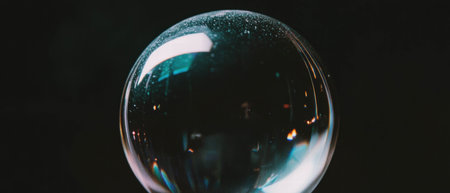 Christmas and New Year Holidays precious backdrop. Frozen snow globe christmas magic ball with flying snowflakes. Winter Background with copy space close-up. Macro shot of ice patterns frosted on ball of soap against black abstract bokeh background.