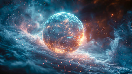 A captivating cosmic sphere floats amidst a vibrant sea of nebulae and twinkling stars, showcasing the beauty of the universe in a mesmerizing display.