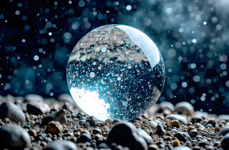 A crystal ball reflects a starry night sky, illuminated by soft blue light, creating a mystical atmosphere