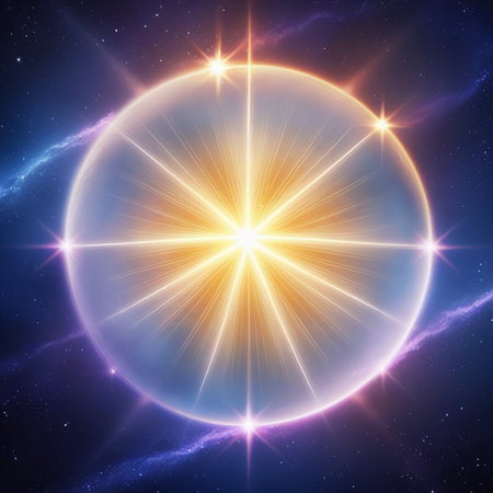 This image captures a breathtaking view of a radiant starburst set against the backdrop of a cosmic night. The central star emits brilliant beams of light that spread outwards in a symmetrical pattern, creating a mesmerizing display of celestial beauty. The surrounding space is filled with a dark, star-studded expanse, adding to the sense of depth and mystery.