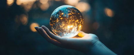 A hand gently cradles a transparent globe that sparkles with stars and light. This captivating image conveys themes of magic, wonder, and exploration, inviting viewers into a dreamlike atmosphere.
