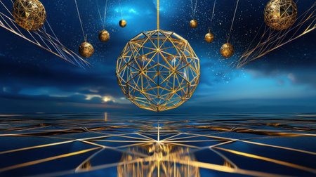 This abstract artwork features a golden sphere suspended in cosmic space, surrounded by shimmering reflections and intricate geometry, conveying a futuristic and meditative ambiance.