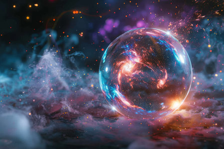 A perfectly spherical glass orb is centered against a dark background. Within the orb, a burst of colorful light particles erupts, resembling a miniature galaxy or a controlled explosion of energy. Orange and blue hues dominate the outer glow of the sphere, while the internal particles display a spectrum of colors.