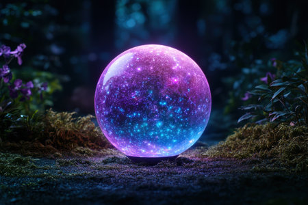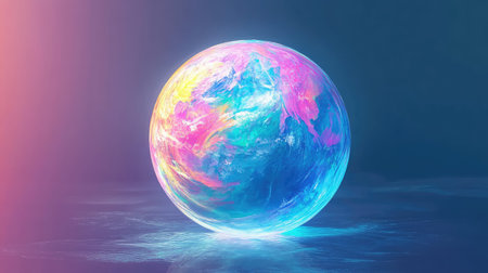 An artistic rendering presents a glowing orb in vibrant hues of blue, purple, and pink. The spherical object appears to float above a reflective surface, possibly mirroring the cosmos. The composition features a dark background, suggesting a night or space setting, creating a visually striking abstract image suitable for various commercial uses.