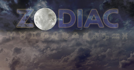 Twelve celestial signs of the Zodiac and Moon Night Sky - dark blue night sky background with 12 astrology signs beneath the word ZODIAC and a bright full moon in place of the O with copy space below