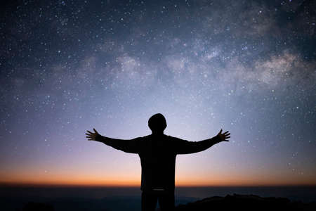Silhouette of young traveler wearing sweater raise both hands and watched the star and milky way alone on top of the mountain. He enjoyed traveling and was successful when he reached the summit.