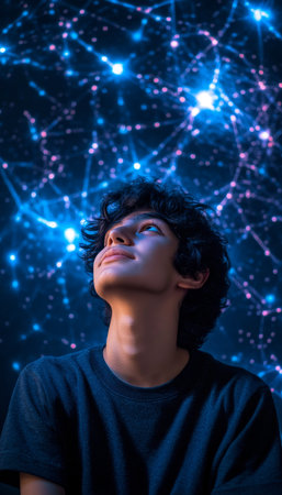 A young man looks upward at a vibrant night sky filled with sparkling lights and soft clouds.
