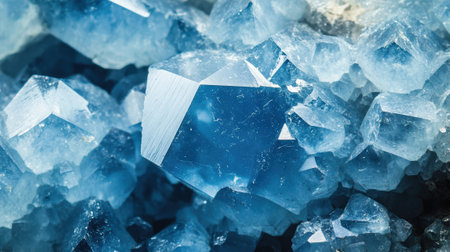 Close-up macro shot of radiant blue ice crystals, highlighting their sharp, transparent edges and intricate frozen textures.