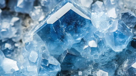 Blue crystal mineral cluster with rough texture and macro pattern closeup. Geology and gemstone concept for abstract background.