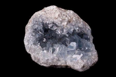 Real light blue celestine crystal cluster isolated on black background with no shadows