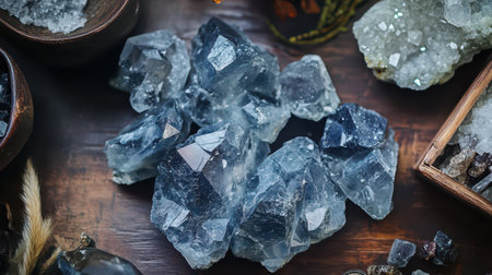Various blue crystal pieces are arranged on a rustic wooden surface showcasing their natural beauty and unique shapes in soft light.