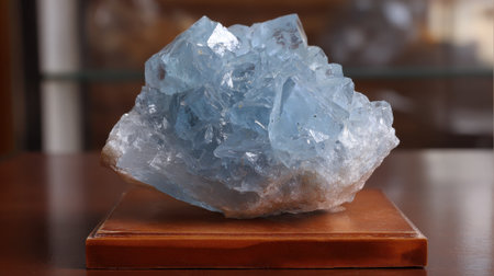 A stunning sky blue mineral sits prominently on a polished wooden platform. It glimmers under the bright lights of a showcase showing its intricate crystalline structure.