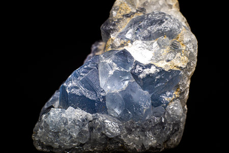 Celestine mineral stone macro on microcline on black background close up