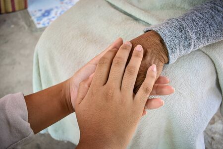 Close up granddaughter takes care of the health sick grandmother at home by holding hands. Lifestyle support the love of the family.