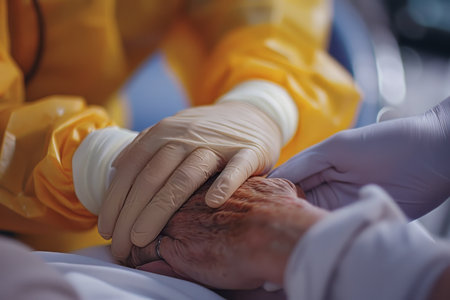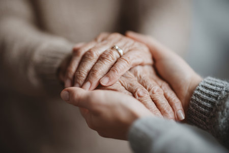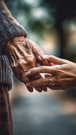 Caregiver provides comfort and support holding an elderly person's hand