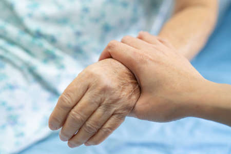 Holding Touching hands Asian senior or elderly old lady woman patient with love, care, helping, encourage and empathy at nursing hospital ward, healthy strong medical concept