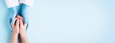 Doctors hands in gloves holding mans hands.