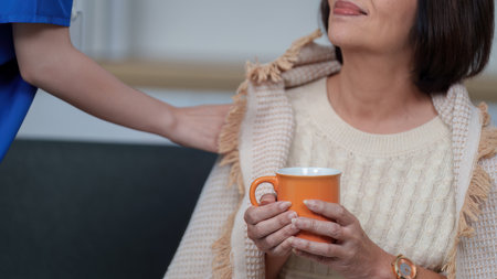 Caregiver providing comfort with warm drink to elderly woman