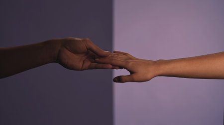 Hands diagonally reching to each other and fingers slightly touch
