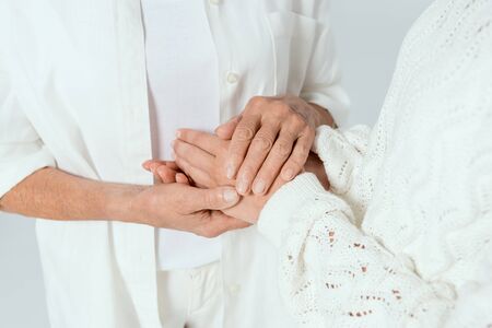cropped view of mother and daughter holding hands isolated on grey