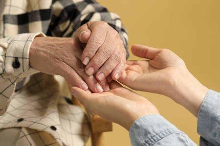 Young and elderly women holding hands on beige background, closeup