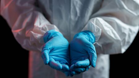 Woman in hazmat suit open the palm of the hand
