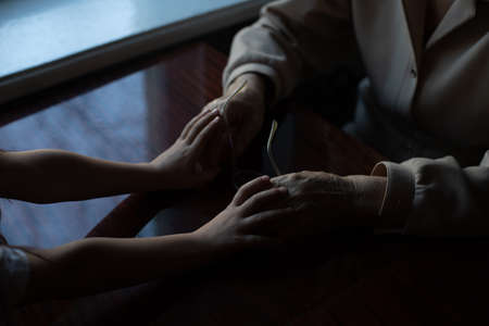 Hands of the old man and a young woman. close up.