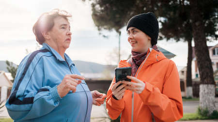 Portrait of a smiling elderly and young woman with a phone in her hand. Family walks in the open air. Communication concept.