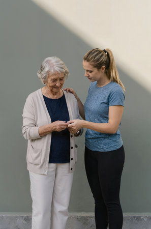A touching moment of an elderly woman and her caregiver sharing a warm connection while walking.