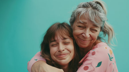 Happy woman hugging old senior mother. Family relations, bonding and togetherness. Generative AI illustration