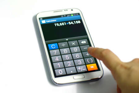 Finger of man who is using the calculator application in mobile phone on the white desk