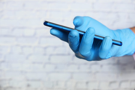 Hands wearing medical gloves and smart phone, corona virus concept