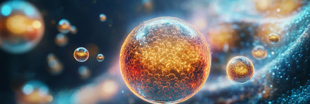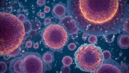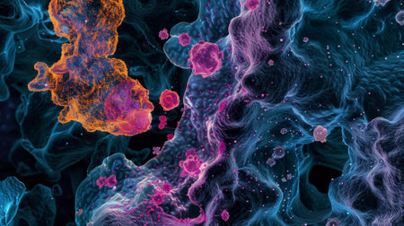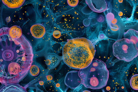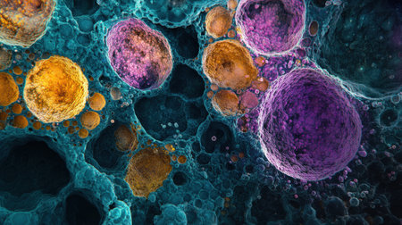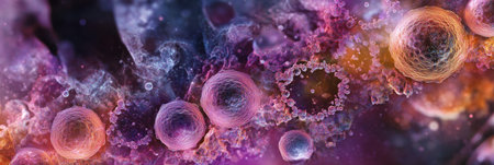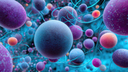 This image presents an abstract illustration featuring numerous spherical biological cells. The composition showcases a variety of colors, including purple, blue, and orange, with intricate textures and highlights. The overall style suggests a microscopic environment. It could be useful in scientific or educational publications, or in designs.