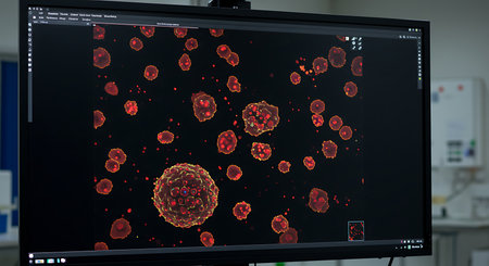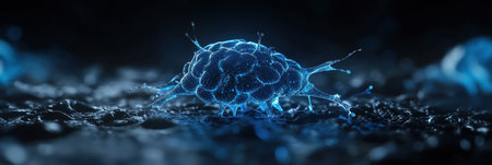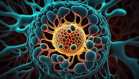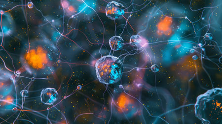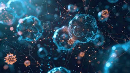 Detailed medical research concept featuring cellular structures, networks, and data visualization