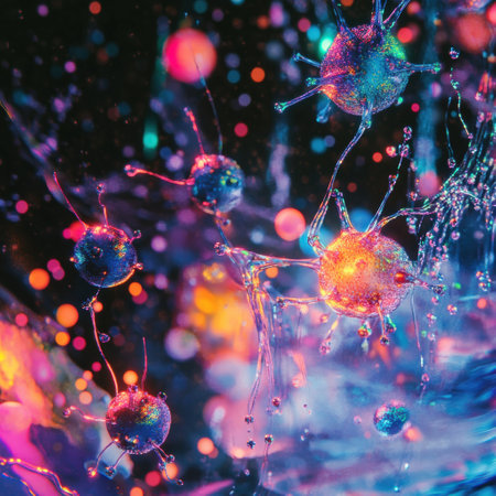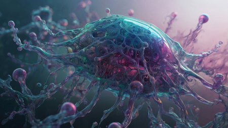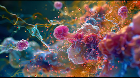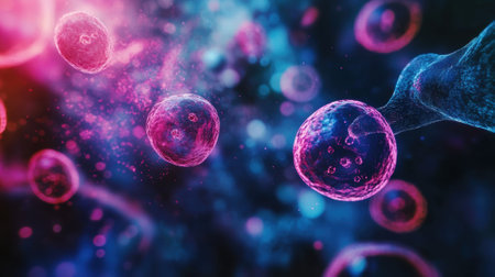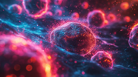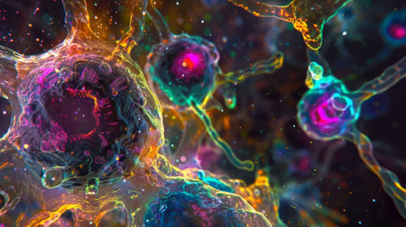 Explore the mesmerizing world of cells with vibrant colors and intricate details. This digital artwork captures life at a microscopic level, showcasing elegance and complexity.